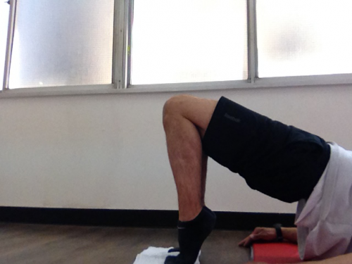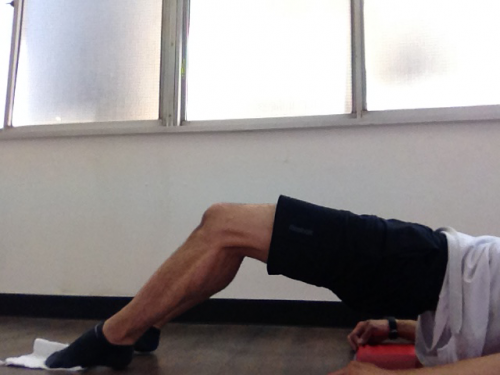 かかとは絶えず浮いた状態になるように、3㎝くらいの厚さのモノを、かかとの下に置きます。